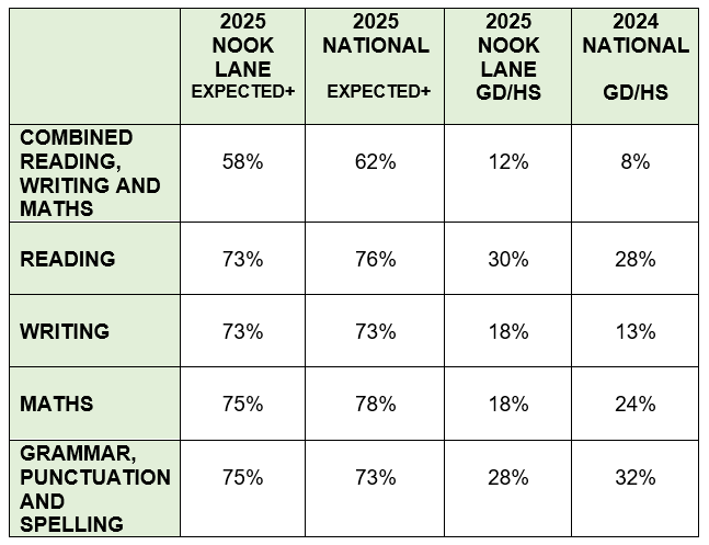 Please see the table opposite for Nook Lane’s Y6 SATS results for this year, which again show that more children at our school achieved the “Expected Standard” in all subjects when compared with national averages.